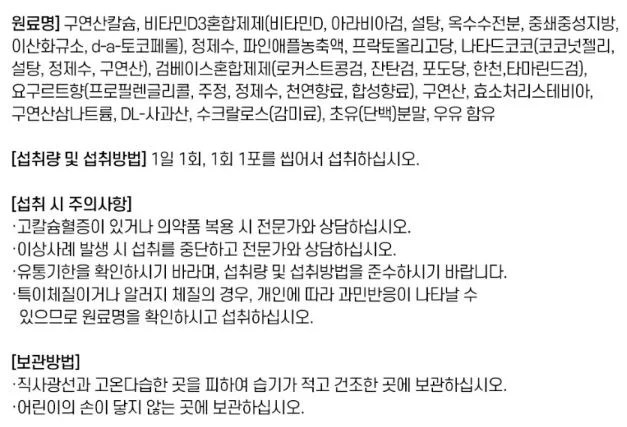 요구르트 맛이며 칼슘과 비타민 D가 포함되어 있습니다. 성장기 아이에게 강력 추천합니다. 섭취시 고칼슘혈증이 있으시거나 관련 약품 복용중이라면 전문의와 상담이 필요합니다.