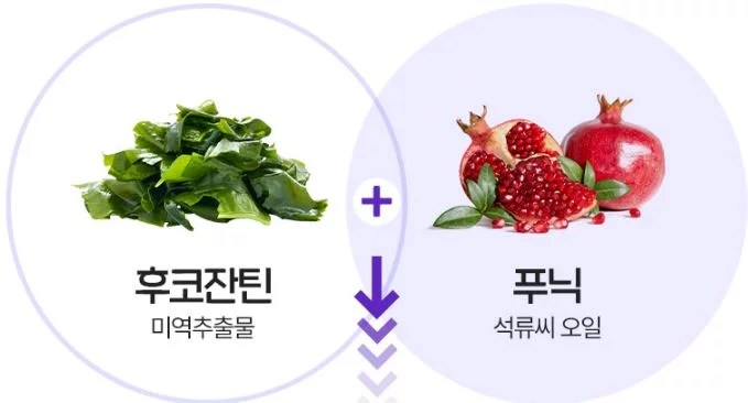 그림에서 볼 수 있는 미역추출물인 후코잔틴과 석류씨 오일인 푸닉이 합쳐져 100%잔티젠이 나이트버닝 1알에 들어있습니다.