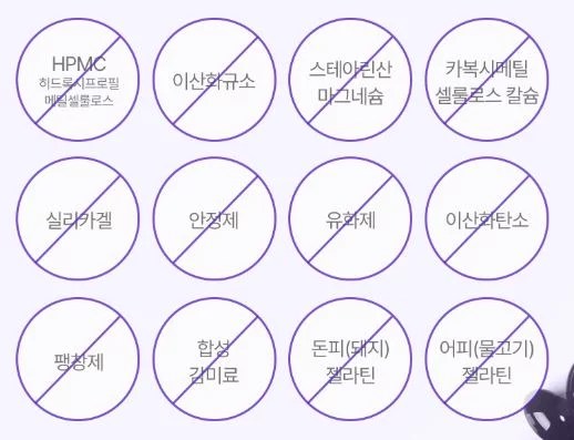 그림과 같이 이산화규소, 안정제, 이산화탄소, 합성감미료등 기능성과 상관없는 물질을 최대한 들어가지 않기 때문에 건강적 측면에서도 우수하다고 할 수 있습니다.