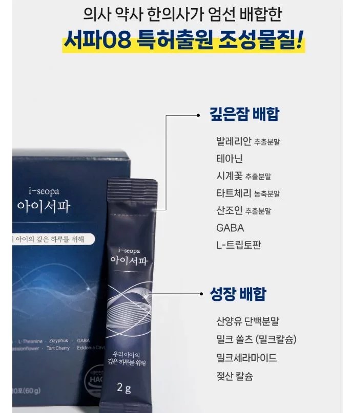 유아 중학생 고등학생 청소년 키크는 영양제 첫번째로 알아볼 제품은 아이서파라고 불리는 제품입니다. 서파 08특허 출원 조성물질을 배합해 만든 것이 특징인데요